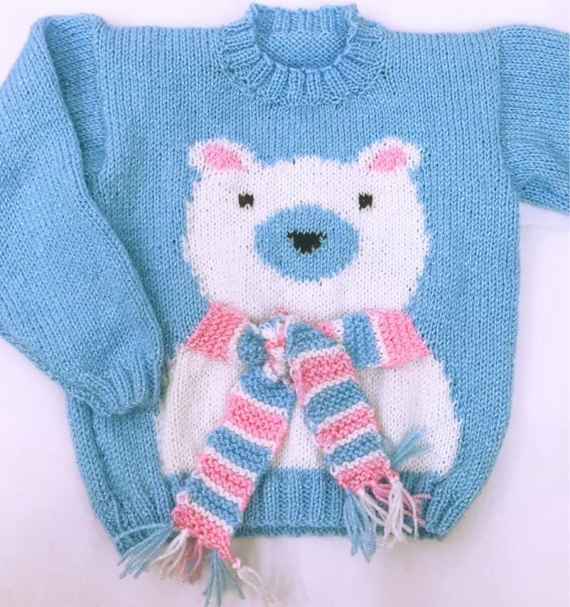 Wrap them up warm in an adorable intarsia sweater complete with tie on scarf – awww!