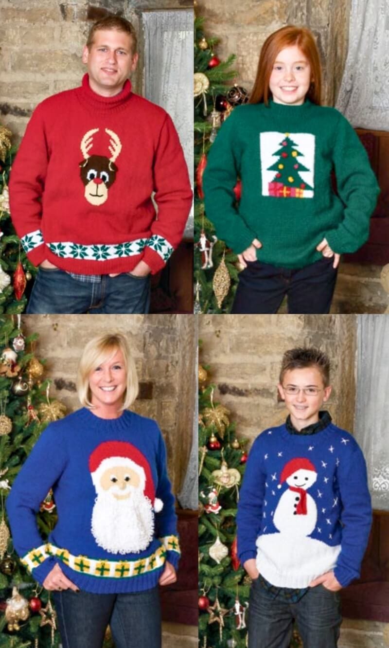 Choose from 4 charted designs: Santa, snowman, reindeer and a Christmas tree. Whether everyone wants to wear matching sweaters or choose their own theme, these patterns are all you need.