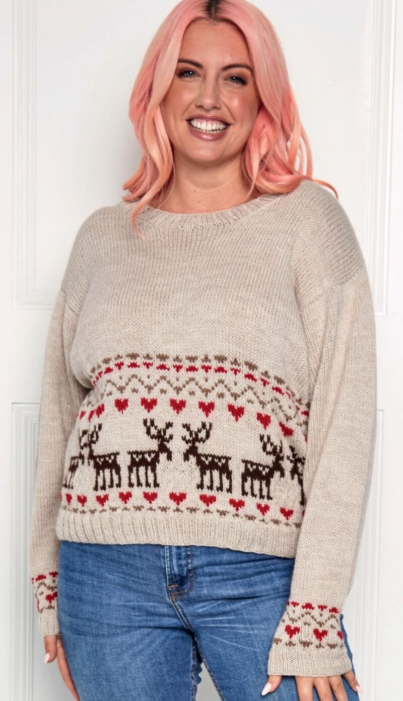 There’s lot of different techniques for intermediate knitters to enjoy here. The main sweater motifs are knit using intarsia, 2 of the adult jumpers have stranded colour work borders at the bottom and there’s 3d elements like Santa’s loop stitch beard and attaching ears, noses, buttons & baubles – oh my!