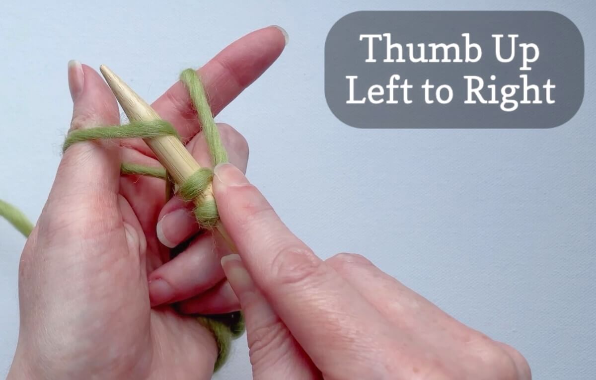 Holding the yarn ends in the starting position, point your left thumb up. With your right hand, put your needle tip under the yarn on the outside of your thumb from left to right.