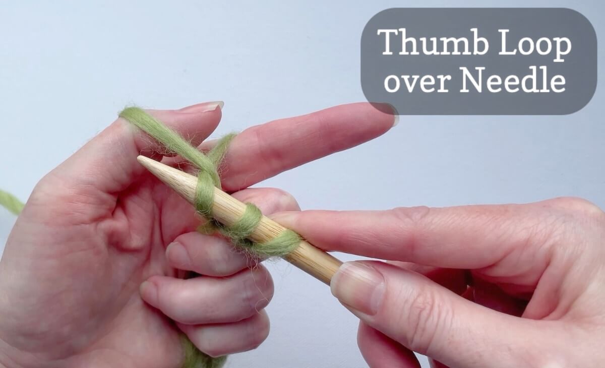 Bring your thumb back so that your needle tip comes through the yarn loop around your thumb. This adds a stitch on your needle.